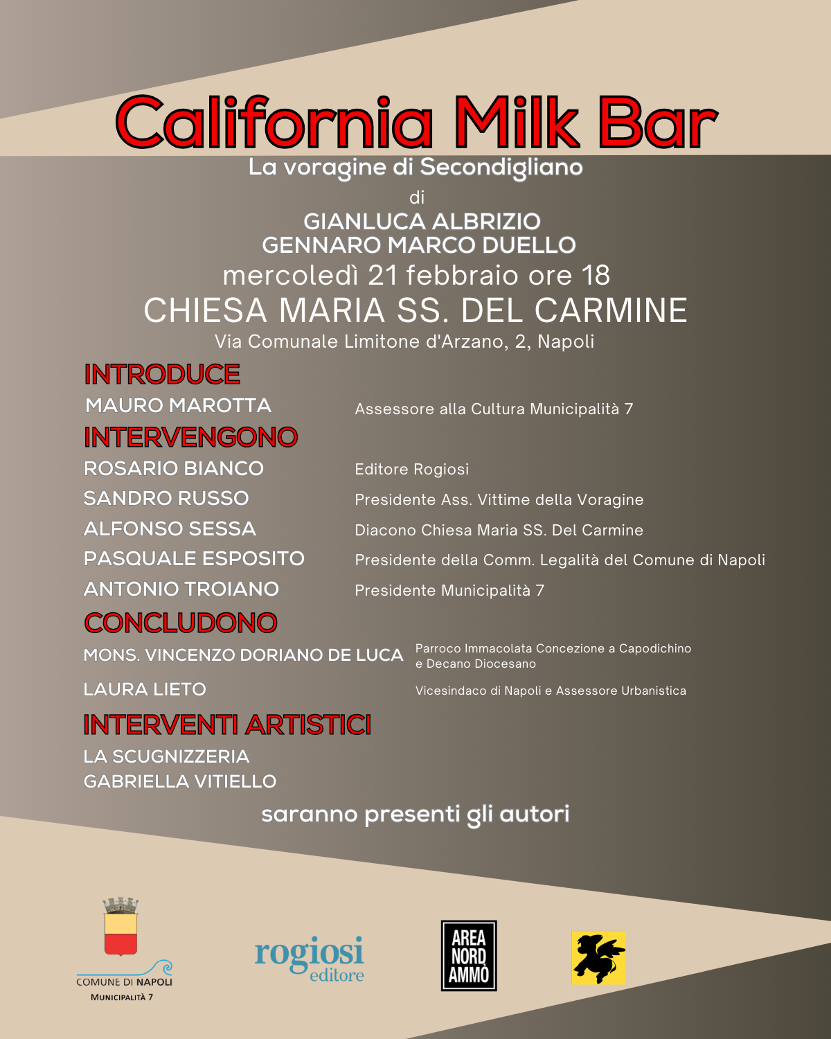 Mercoledì 21 febbraio alle ore 18 presso la chiesa Maria SS. del Carmine in via Comunale Limitone d’Arzano, 2, Napoli sarà presentato il libro “California Milk Bar - La voragine di Secondigliano” (Rogiosi editore) di Gianluca Albrizio e Gennaro Marco Duello . Il libro ripercorre la storia del tragico evento del 23 settembre 1996 in cui persero la vita 11 persone e che ha segnato, come una sorta di 11 settembre, tutta la comunità dell’Area Nord. Per la prima volta questa storia trova occasione di spazio nel proprio quartiere. Saranno presenti i rappresentanti delle istituzioni e della diocesi di Napoli. Introduce Mauro Marotta , Assessore alla Cultura Municipalità 7; intervengono Rosario Bianco , editore Rogiosi, Sandro Russo , Associazione vittime della voragine, Alfonso Sessa , diacono chiesa Maria SS. del Carmine, Pasquale Esposito , Presidente Commissione Legalità Comune di Napoli; Antonio Troiano , Presidente Municipalità 7; concludono Mons . Vincenzo Doriano De Luca , Decano Diocesano e parroco Immacolata Concezione a Capodichino; con gli interventi artistici dell’attrice Gabriella Vitiello e del gruppo La Scugnizzeria .